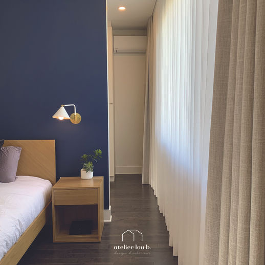 L'inspiration était de créer un oasis de paix pour les parents dans leur nouvelle chambre à coucher, salle de bains et garde-robe. Un look à la fois moderne et chaleureux avec des bleus foncés, des blancs cassés, un foyer au gaz, une tuile ceppo di gre et des rideaux pleine hauteur, entres autres. Mission accomplie !